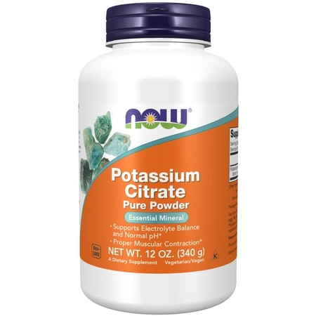 - NOW Potassium Citrate Powder to łatwo przyswajalna forma potasu w proszku, wspierająca równowagę elektrolitową, funkcjonowanie mięśni i zdrowie układu nerwowego. Pomaga w utrzymaniu prawidłowego ciśnienia krwi i wspiera funkcję nerek.